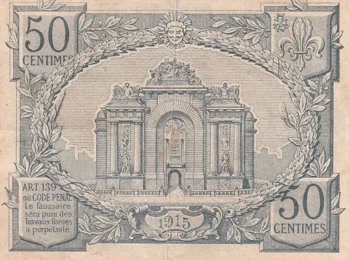 The 50 centime banknote from the Banque d'Émission de Lille, dated August 1915, belongs to the second series issued by this institution. The front of the banknote, written in Latin, features the following inscriptions: "BANQUE D’ÉMISSION DE LILLE AOÛT 1915" at the top of the banknote. The face value "50 CENTIMES" is indicated in the center.