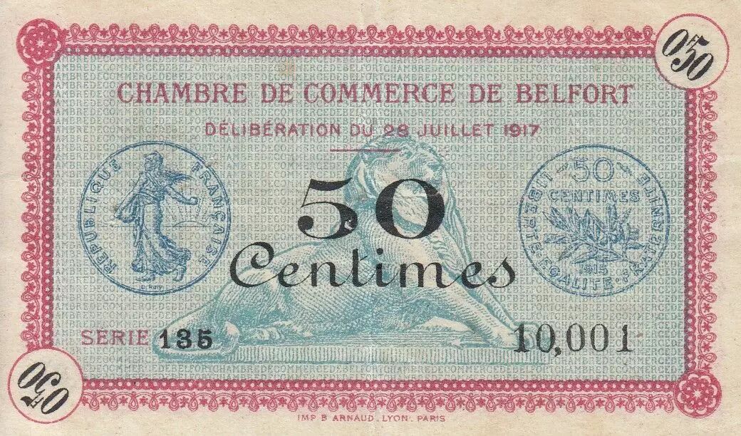 The 50-cent note issued by the Belfort Chamber of Commerce, dated July 28, 1917, represents a form of emergency currency issued during a time of conflict. This type of note was produced to alleviate the lack of coinageDivision monétaire, pièce de monnaie ou billet de banque ayant cours légal.Division monétaire, pièce de monnaie ou billet de banque ayant cours légal.Division monétaire, pièce de monnaie ou billet de banque ayant cours légal.Division monétaire, pièce de monnaie ou billet de banque ayant cours légal.Division monétaire, pièce de monnaie ou billet de banque ayant cours légal.Division monétaire, pièce de monnaie ou billet de banque ayant cours légal. métalliqueDivision monétaire, pièce de monnaie ou billet de banque ayant cours légal.Division monétaire, pièce de monnaie ou billet de banque ayant cours légal.Division monétaire, pièce de monnaie ou billet de banque ayant cours légal.Division monétaire, pièce de monnaie ou billet de banque ayant cours légal.Division monétaire, pièce de monnaie ou billet de banque ayant cours légal.Division monétaire, pièce de monnaie ou billet de banque ayant cours légal.Division monétaire, pièce de monnaie ou billet de banque ayant cours légal.Division monétaire, pièce de monnaie ou billet de banque ayant cours légal.Division monétaire, pièce de monnaie ou billet de banque ayant cours légal.Division monétaire, pièce de monnaie ou billet de banque ayant cours légal.Division monétaire, pièce de monnaie ou billet de banque ayant cours légal.Division monétaire, pièce de monnaie ou billet de banque ayant cours légal. in circulation during the First World War.
