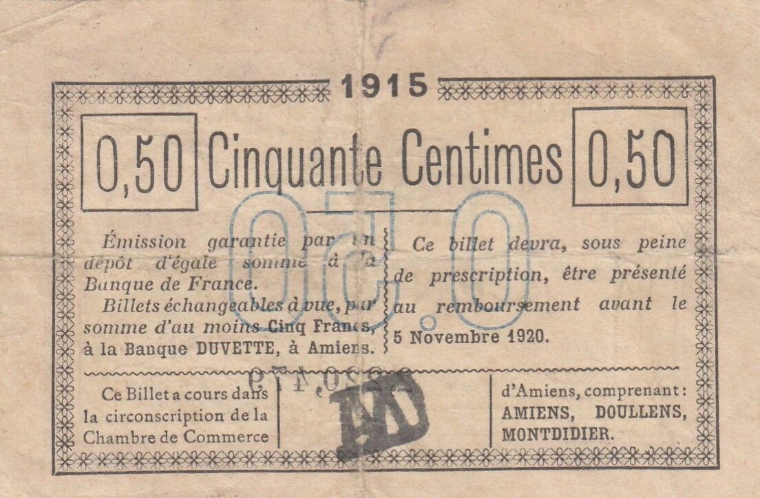 This 50 cent banknote was issued by the Amiens Chamber of Commerce in 1915.