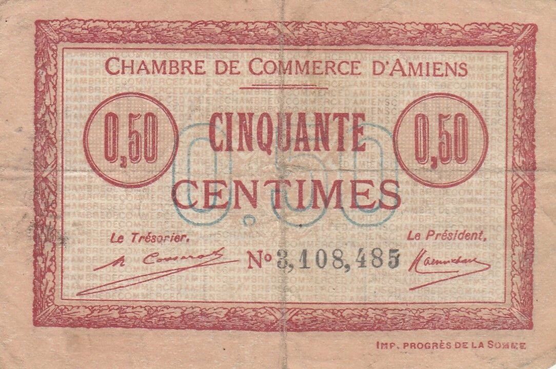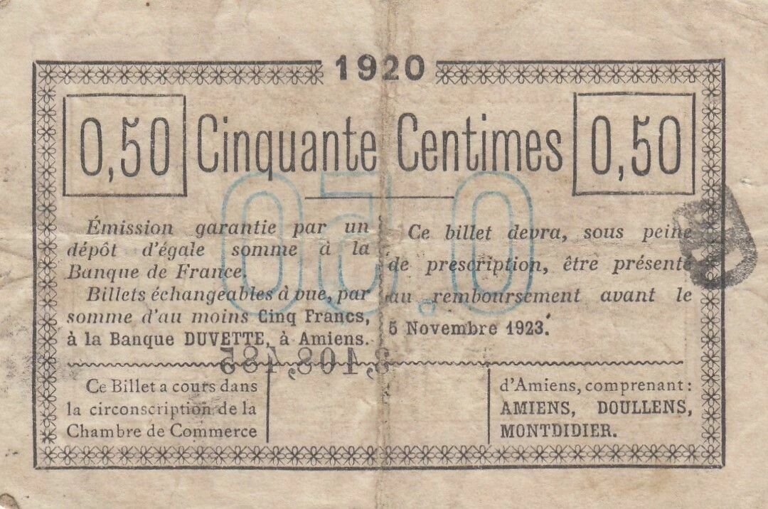 This 50 centime note was issued by the Amiens Chamber of Commerce in 1920. It represents a form of emergency currency, issued locally during a period of cash shortage.