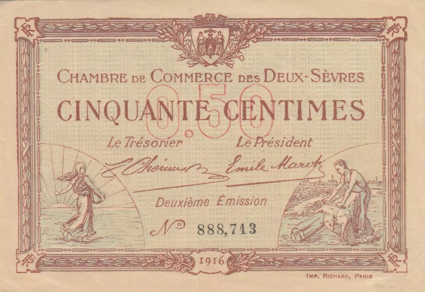 Home > French Banknotes > Necessity Money (1789-1945) > City and Municipal Bonds 1914-1925 > France 50 Cents - Chamber of Commerce - Deux-Sèvres - 10-07-1916 - Serial 888