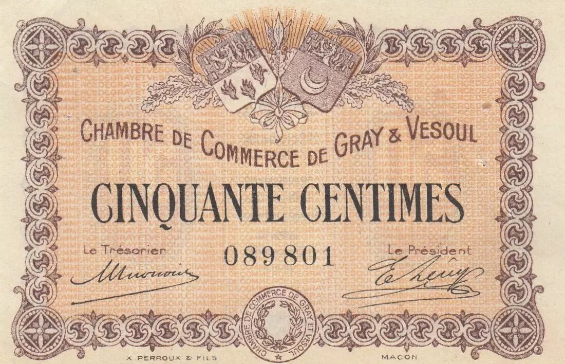 Home > French Banknotes > Necessity Money (1789-1945) > 1914-1925 Chamber of Commerce > France 50 Cents - Chamber of commerce - Gray and Vesoul - 04-10-1915 - Serial 089
