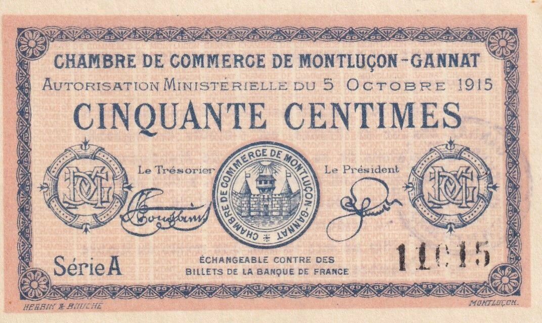 This 50 cent emergency banknote was issued by the Chamber of Commerce of Montluçon-Gannat, dated October 5, 1915, and is part of series A. This is a wartime issue, intended to compensate for the lack of small change.