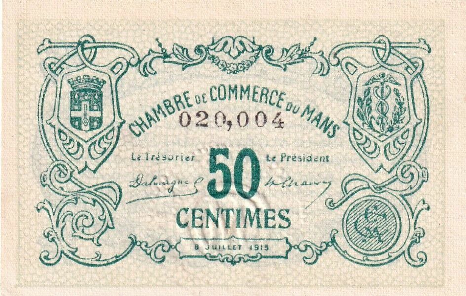 This 50 centime note was issued by the Chamber of Commerce of Le Mans on July 8, 1915. It belongs to the first series of notes issued by this institution.