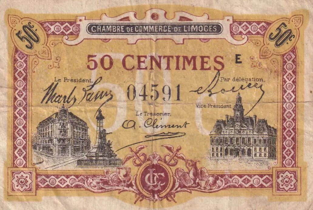 On the front of the note, one can read the inscription "CHAMBRE DE COMMERCE DE LIMOGES" at the top, followed by the face value "50 CENTIMES" in the center. The series "E" is also mentioned, as well as a unique identification number, "04591". The signatures of the President, the Vice-President by delegation, and the Treasurer are affixed at the bottom.