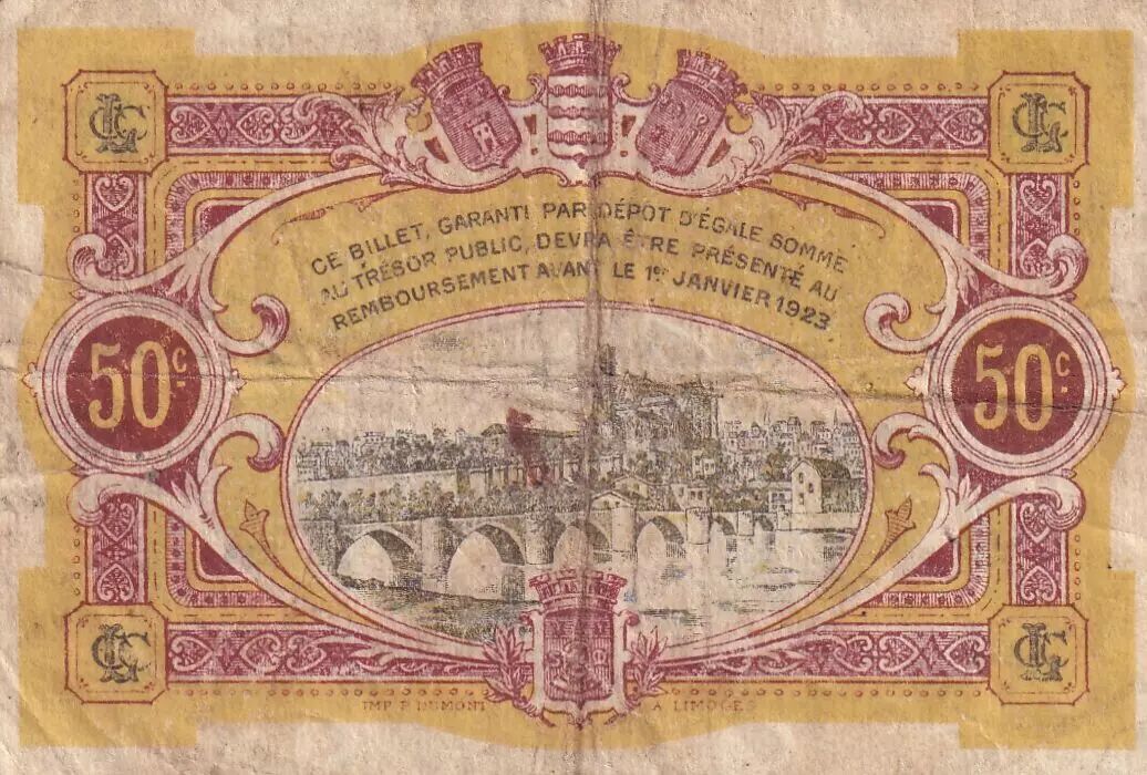 This 50 centime note was issued by the Limoges Chamber of Commerce in 1918 and belongs to Series E.