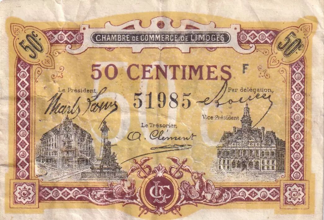 The front of the note bears the following inscriptions: "CHAMBRE DE COMMERCE DE LIMOGES" at the top, followed by the face value "50 CENTIMES" in the center. The series mention "série F" is also present, accompanied by a serial number, here "51985". Signatures appear at the bottom, indicating "Le Président", "Par délégation le Vice-Président" and "Le Trésorier".