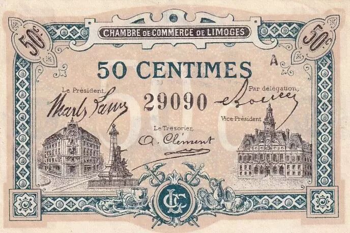 This 50 centime banknote was issued by the Chamber of Commerce of Limoges in France. It dates from the year 1914. The banknote features a dark green frame that contrasts with a beige background.