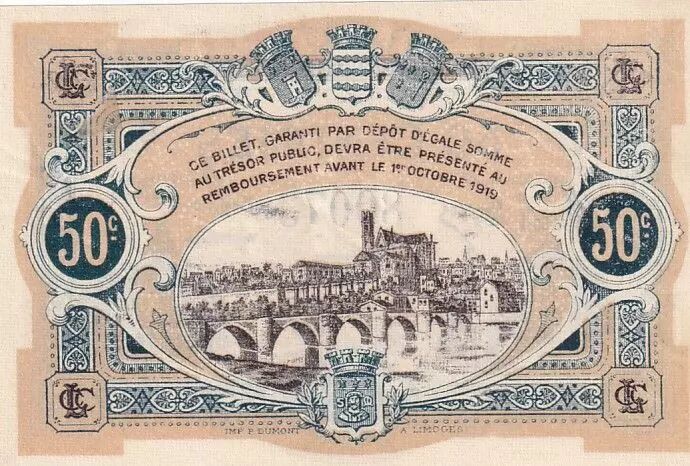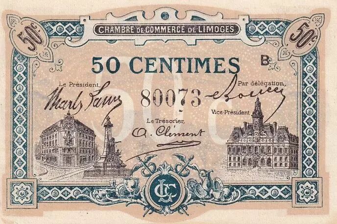 This 50 centime note was issued in France by the Limoges Chamber of Commerce in 1914. It represents a face value of 50 centimes.