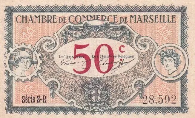 This 50 centime note was issued by the Marseille Chamber of Commerce in 1917. It is from the S-R series. The front of the note features the inscription "CHAMBRE DE COMMERCE DE MARSEILLE" in capital letters. The face value "50 c" is also indicated. The functions of the treasurer and delegated members are mentioned, but the names are not specified.