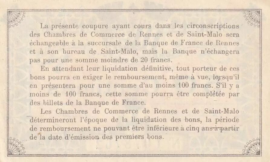 The reverse details the terms of exchange and reimbursement of the banknote. It is stipulated that the banknote is exchangeable at the branch of the Banque de France in Rennes and its office in Saint-Malo, provided that the amount presented reaches at least 20 francs. The Bank reserves the right not to exchange smaller amounts. In addition, it is specified that any holder of these bonds may demand reimbursement on sight if they present them for a sum of at least 100 francs, which may be supplemented by banknotes of the Banque de France if necessary. The Chambers of Commerce of Rennes and Saint-Malo will determine the liquidation date of the bonds, with a reimbursement period of at least five years from the date of issue.