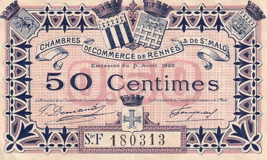 This 50 centime banknote was issued by the Chambers of Commerce of Rennes and Saint-Malo on April 6, 1922. It belongs to Series F. The front of the banknote mentions the issuing institution, namely the Chambers of Commerce of Rennes and Saint-Malo. It also shows the face value of 50 centimes, as well as the signatures of the presidents of the chambers of commerce of Rennes and Saint-Malo.