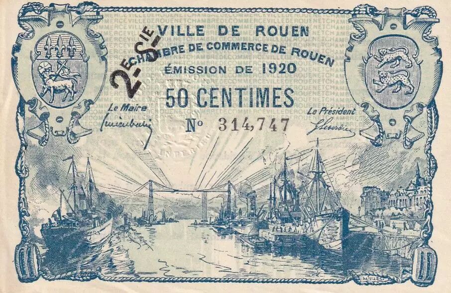 This 50 centime note was issued by the Rouen Chamber of Commerce in 1920. It is a replacement issue originally dating from 1918. The note is "double-sided" and features inscriptions in Latin.