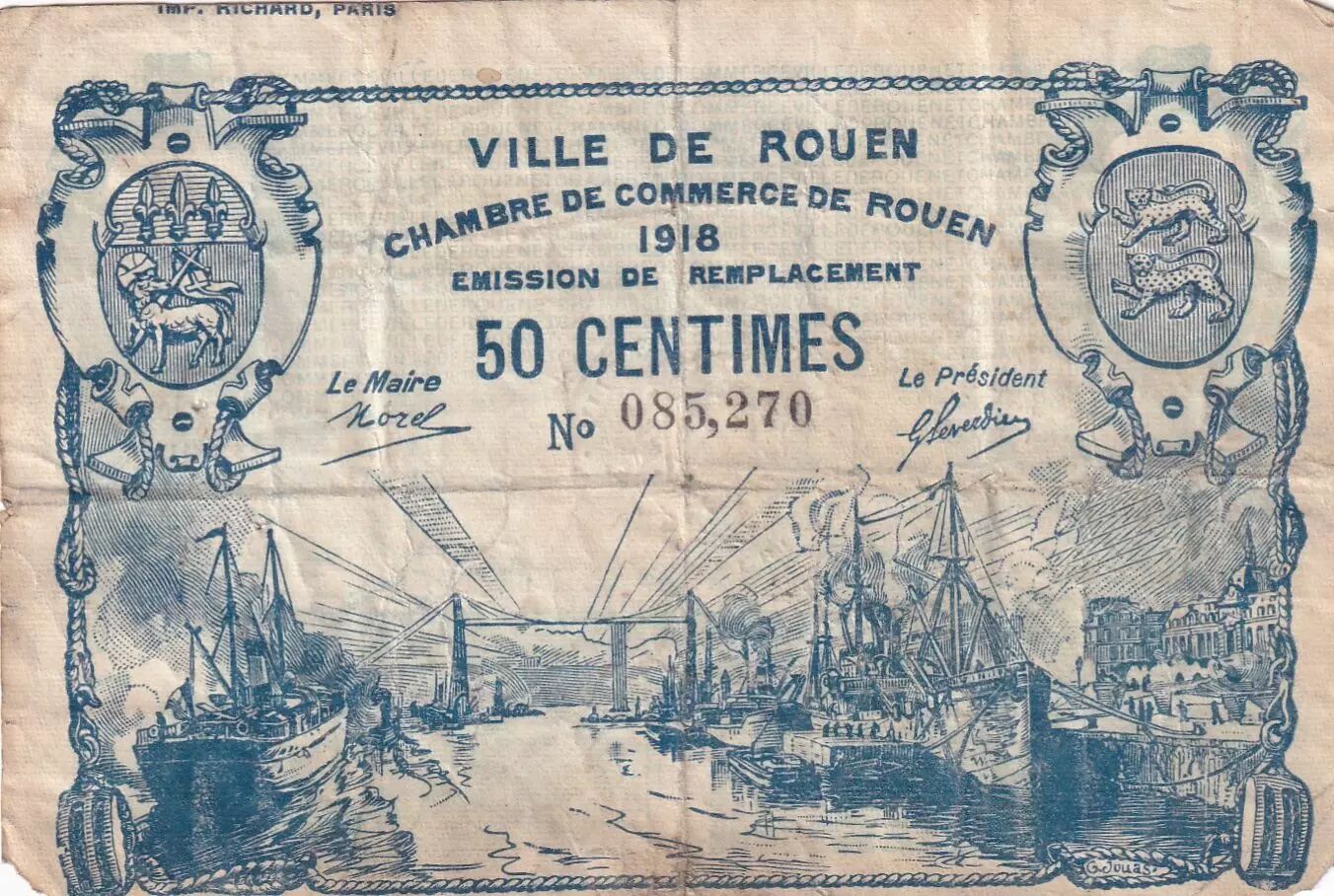 This 50 centime note was issued by the Rouen Chamber of Commerce in 1918 as a replacement issue. The text is written in Latin.