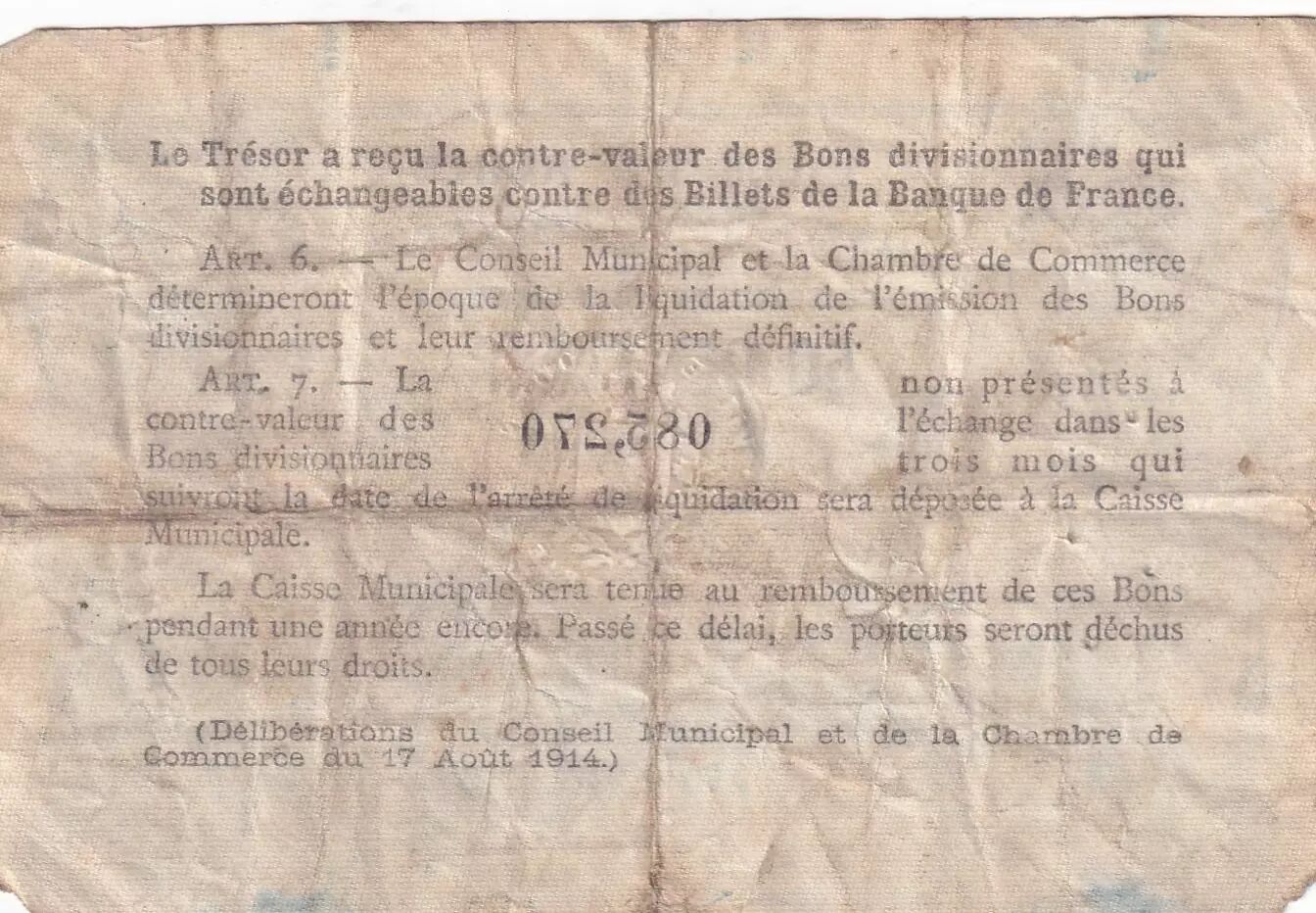 The back of the note bears the inscription "Le Trésor a reçu la contre-valeur..." (The Treasury has received the equivalent value...), followed by a reference to the deliberations of the Municipal Council and the Chamber of Commerce of August 17, 1914. This inscription suggests that the value of the note is guaranteed by the Treasury and that it is based on a joint decision of the local authorities.