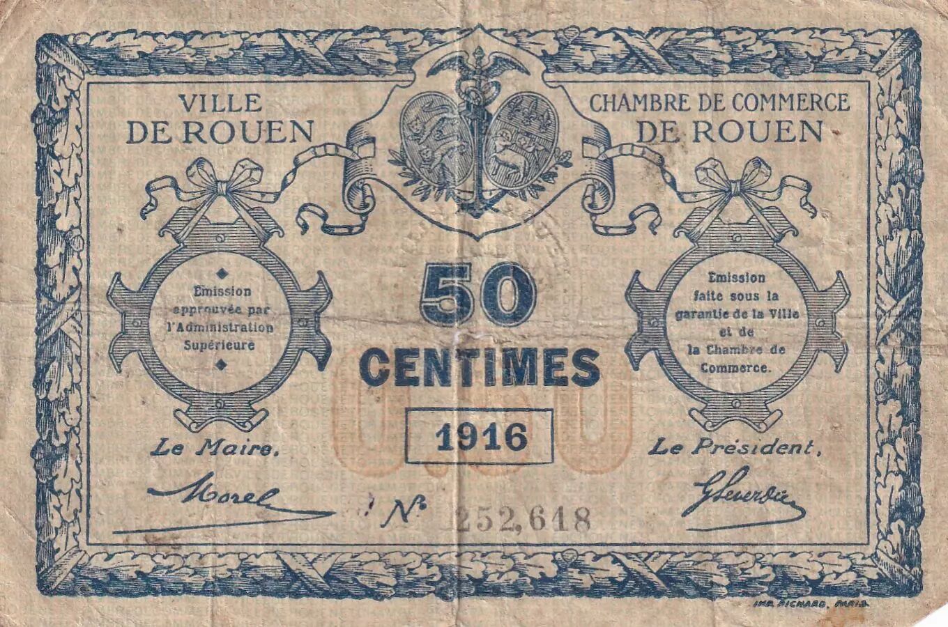 This 50-centime note was issued by the Rouen Chamber of Commerce in 1916. It is a type of product commonly known as a "necessity note," issued in France during World War I to compensate for the lack of small change.