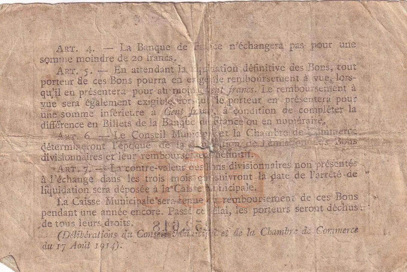 The reverse of the note bears the inscription "Le Trésor a reçu la contre-valeur..." followed by a reference to the deliberations of the Municipal Council and the Chamber of Commerce of August 17, 1914, justifying the issuance of this type of currency. The watermark visible through the paper depicts bees, a symbolic motif often associated with economic activity and industry.