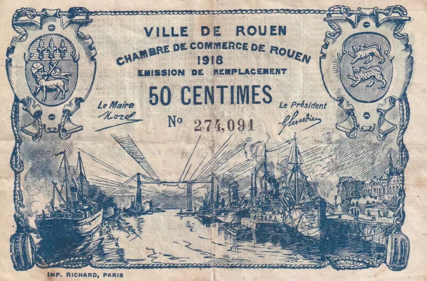 On the front, the words "VILLE DE ROUEN" appear at the top of the note, followed by "CHAMBRE DE COMMERCE DE ROUEN". The year of issue, "1918", is also indicated. The face value, "50 CENTIMES", is clearly visible. The signatures of the Mayor and the President of the Chamber of Commerce are present. A serial number, here "n° 274.091", allows each note to be identified individually. The mention "IMP. RICHARD, PARIS" indicates the printer responsible for the manufacture of the note.
