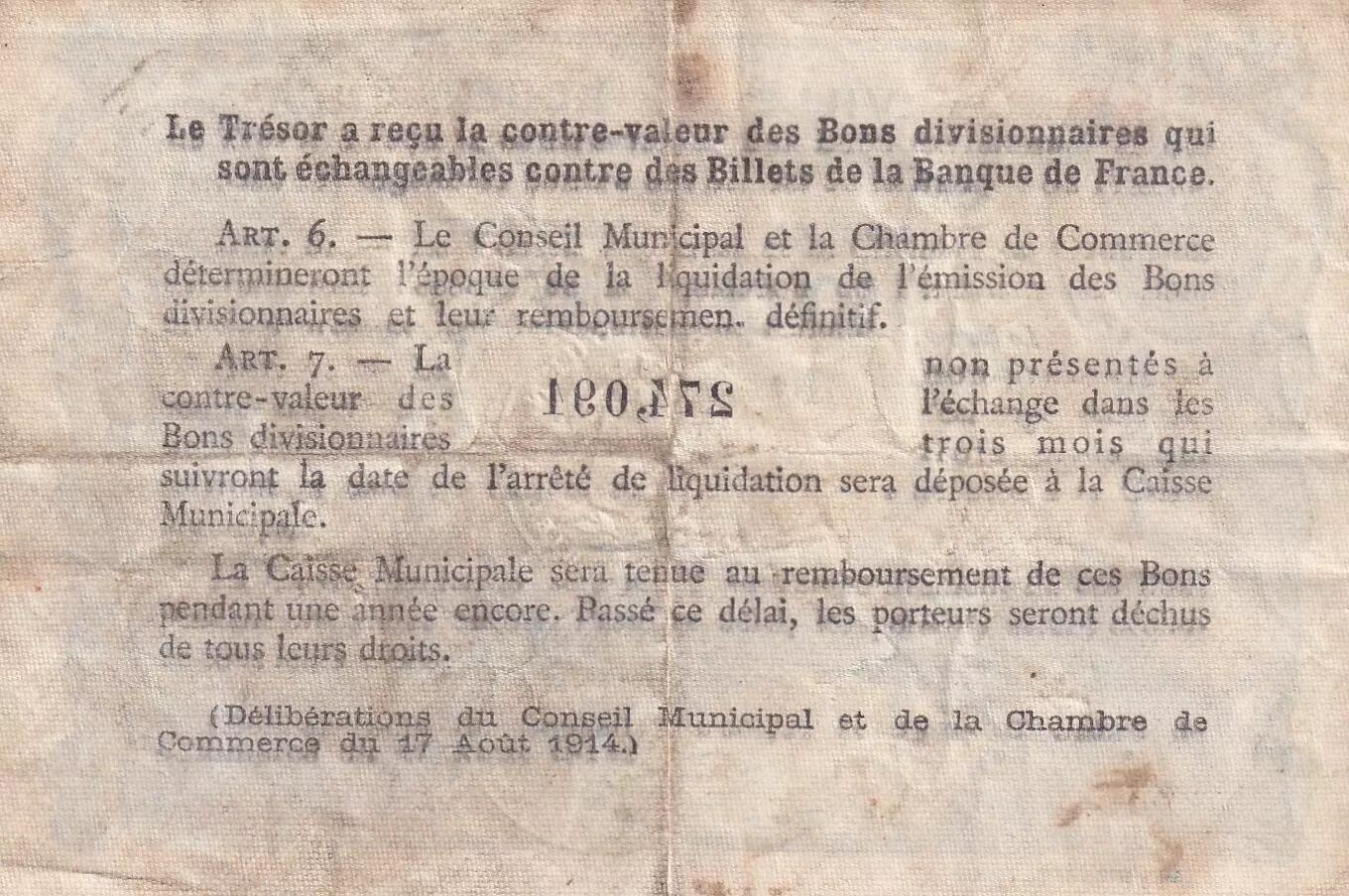 The reverse of the note bears an inscription stating that "The Treasury has received the equivalent value...". Reference is made to the deliberations of the Municipal Council and the Chamber of Commerce of August 17, 1914, which authorized this issue of local currency. This mention underlines the official nature and the guarantee of value of this note.