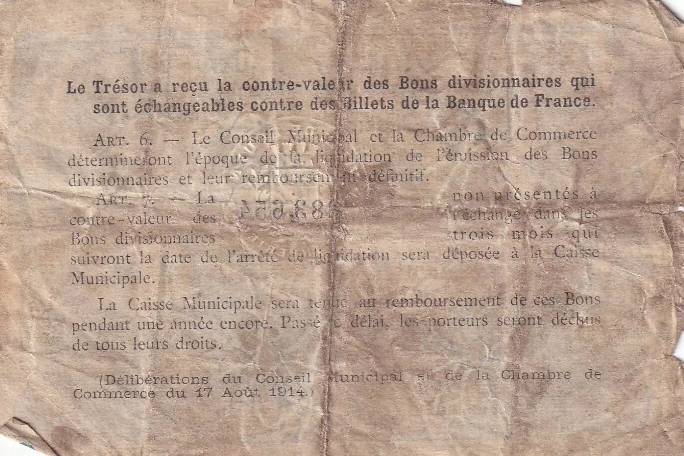The reverse of the banknote contains an inscription in Latin stating that "The Treasury has received the equivalent value...". This inscription refers to the deliberations of the Municipal Council and the Chamber of Commerce of August 17, 1914, highlighting the legal and administrative context of the issuance of this banknote.
