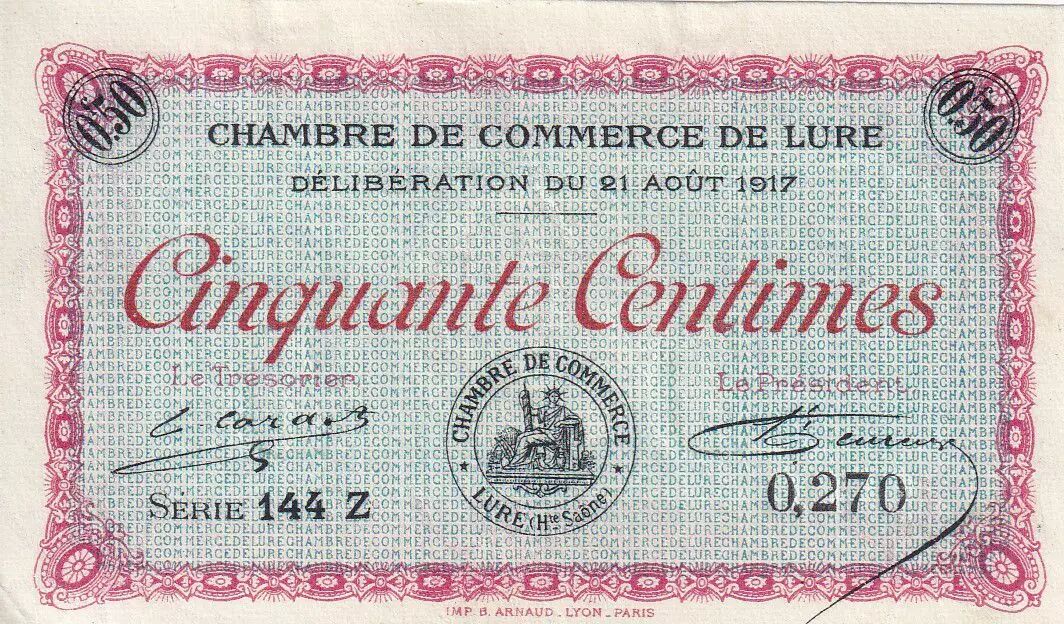 Home > French Banknotes > Necessity Money (1789-1945) > 1914-1925 Chamber of Commerce > France 50 Cents - Chambre de commerce de Lure - 1917 - Serial 144 Z - P.76-18