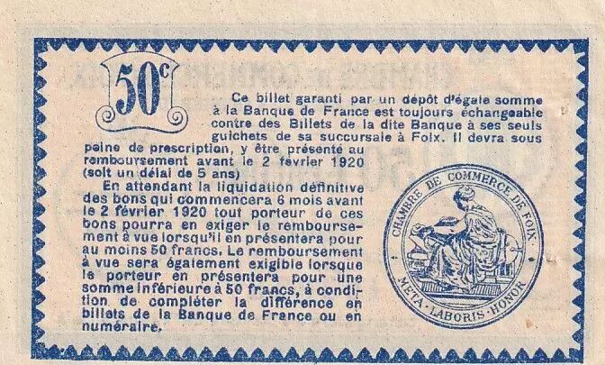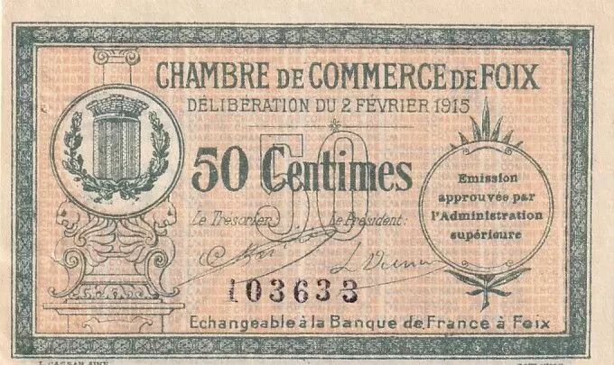 This 50-centime note was issued by the Foix Chamber of Commerce in 1915. It is an emergency issue, implemented in a specific economic context related to the First World War.