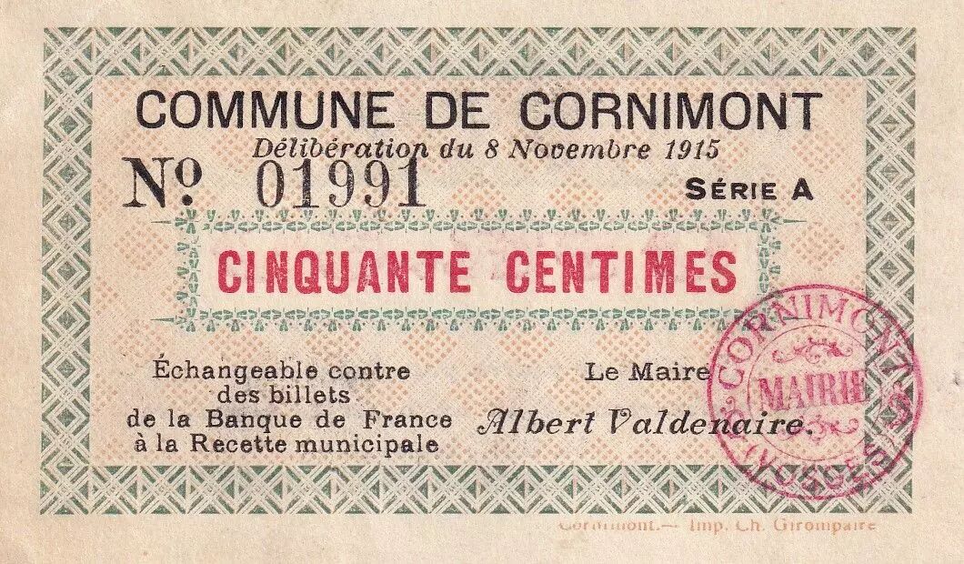 Home > French Banknotes > Necessity Money (1789-1945) > City and Municipal Bonds 1914-1925 > France 50 Cents - Cornimont - 1915 - Serial A - P.88-11