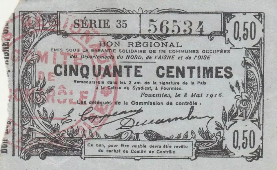 Home > French Banknotes > Necessity Money (1789-1945) > City and Municipal Bonds 1914-1925 > France 50 Cents - Fourmies - Regional Coupon - 08-05-1916 - Serial 35