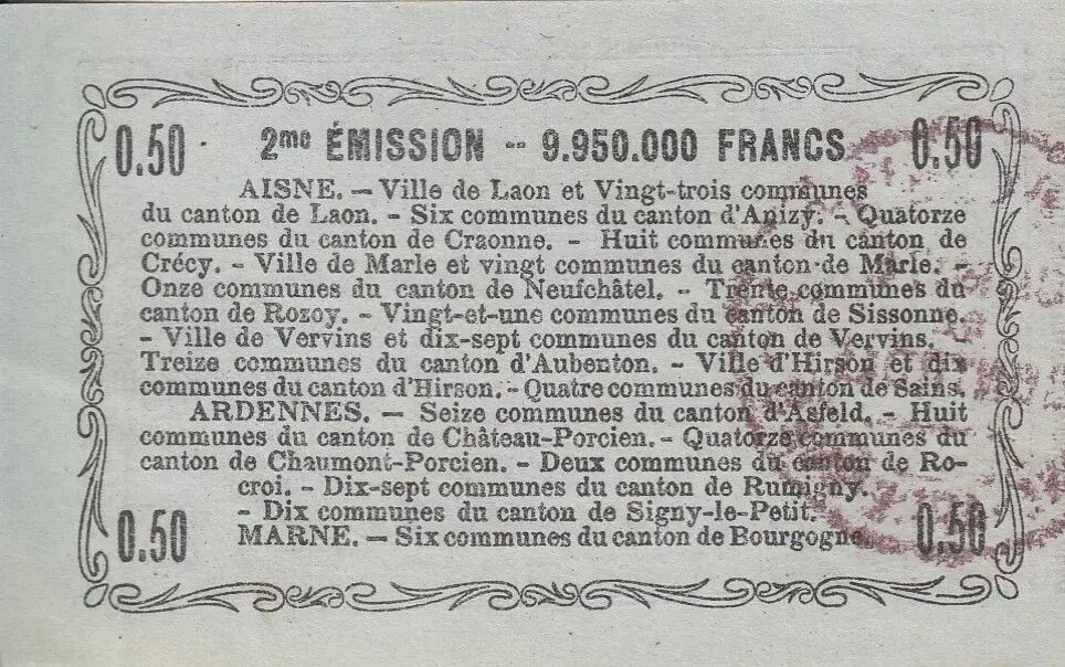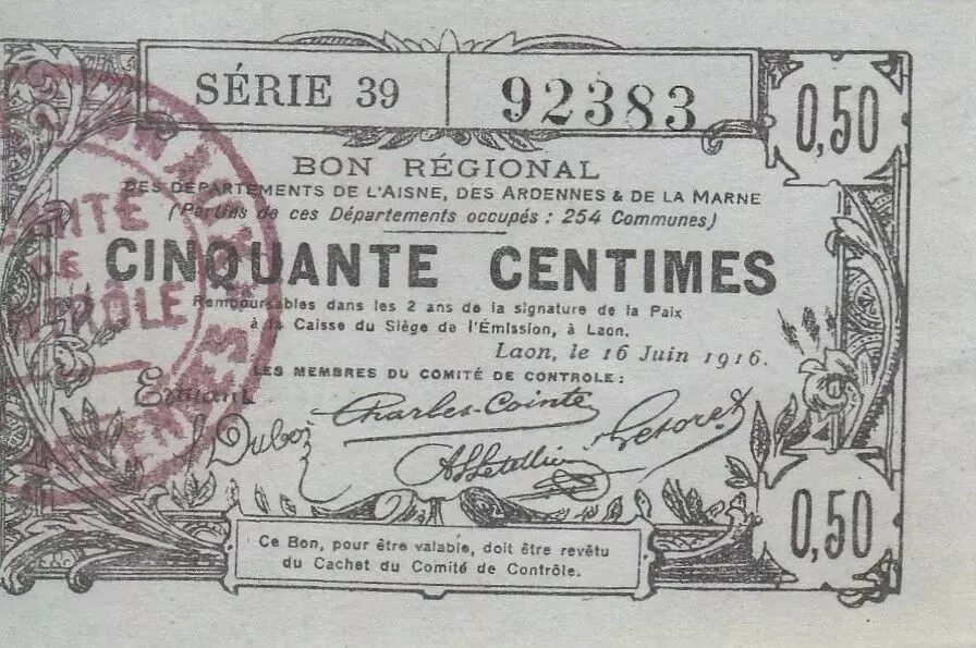 Banknote France 50 Cents - Laon - Regional Coupon - 16-06-1916 - Serial 39