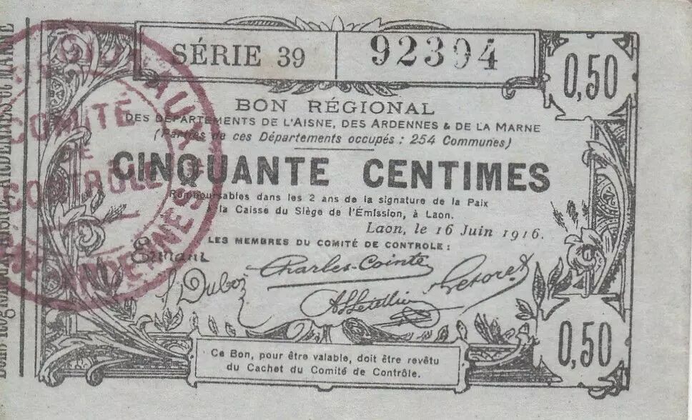 Banknote France 50 Cents - Laon - Regional Coupon - 16-06-1916 - Serial 39