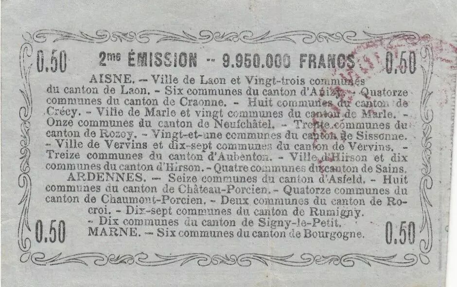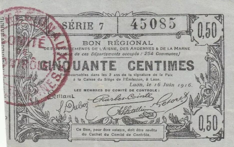 Banknote France 50 Cents - Laon - Regional Coupon - 16-06-1916 - Serial 7