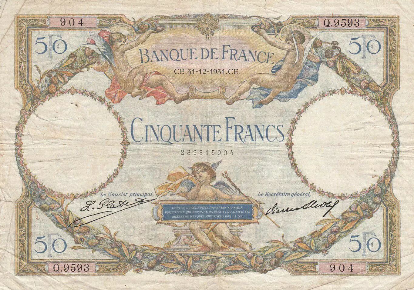 Banknote France 50 Francs Angels - Mercury - 31-12-1931 Série Q.9593 - F to VF