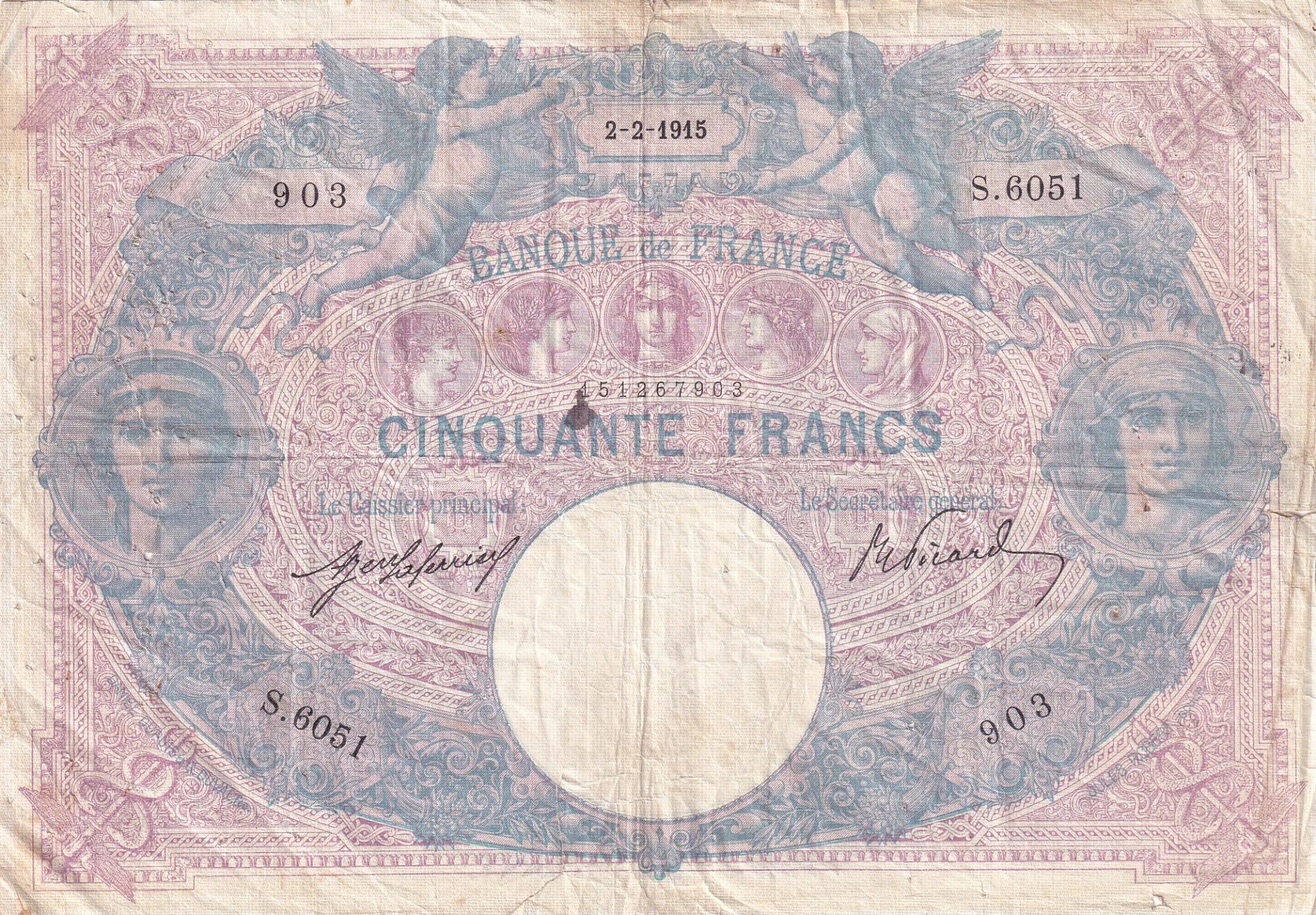 Le billet de 50 Francs Bleu et Rose, daté du 02-02-1915, est un témoignage de l'histoire monétaire française. Ce billet, de la Série S.6051, a été émis par la Banque de France.