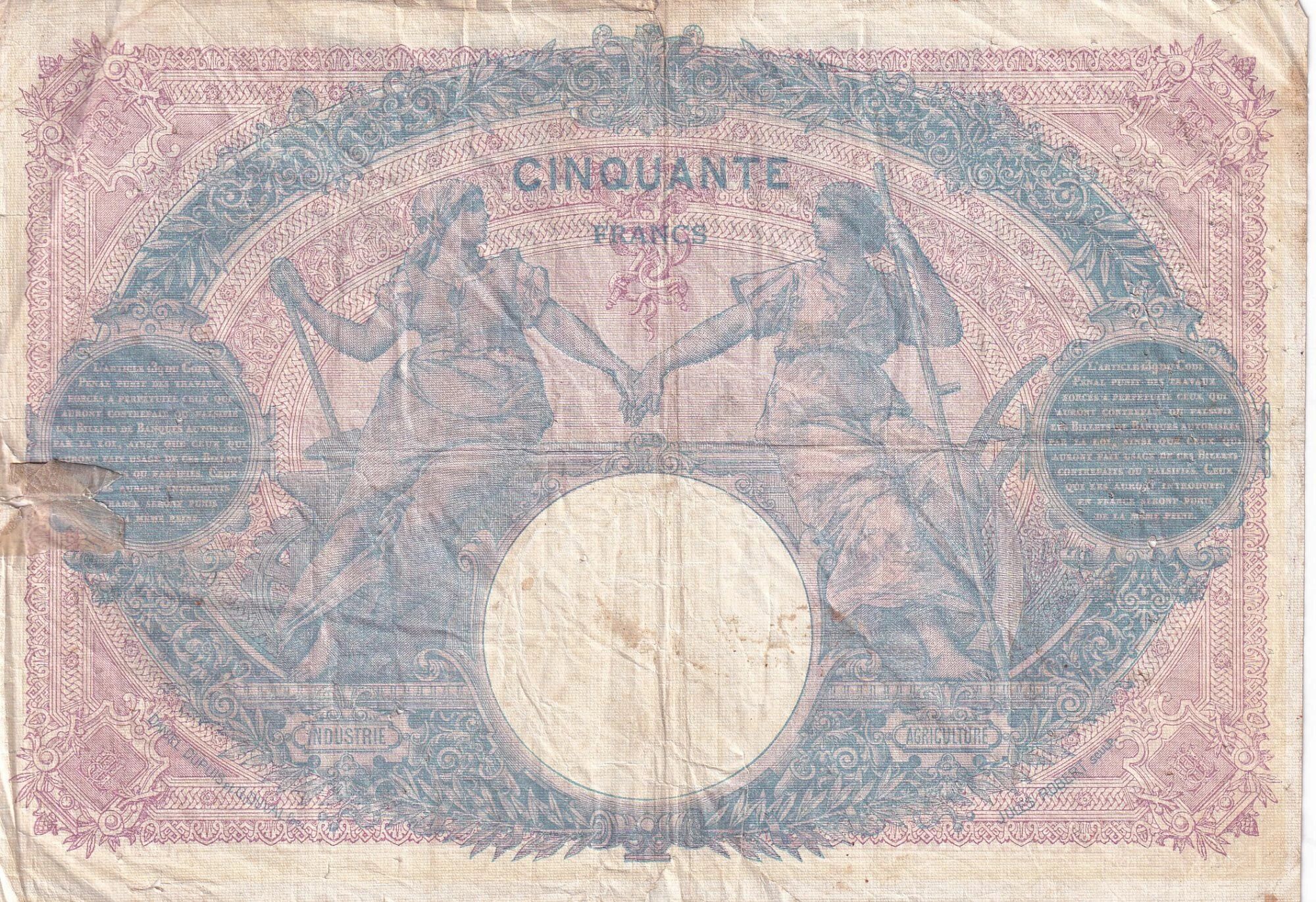 Au verso, le billet met en scène une personnification commune de l'Industrie et de l'Agriculture, représentées se tenant par la main. L'inscription "CINQUANTE FRANCS" est répétée, accompagnée des mots "INDUSTRIE" et "AGRICULTURE" séparés par une barre verticale. Comme au recto, les noms des artistes "DANIEL DUPUIS et G. DUVAL, fec. JULES ROBERT SCULP." sont également mentionnés.