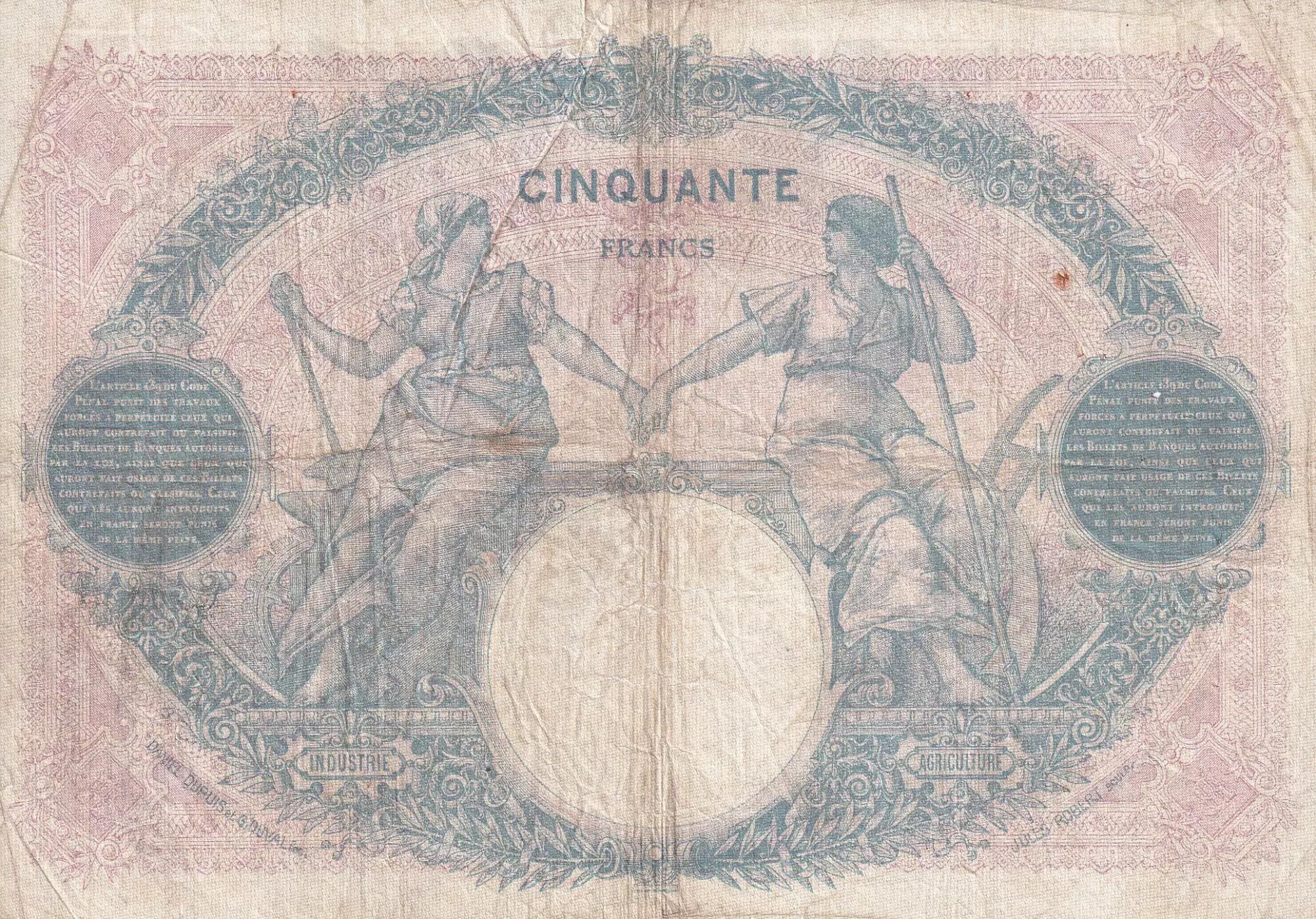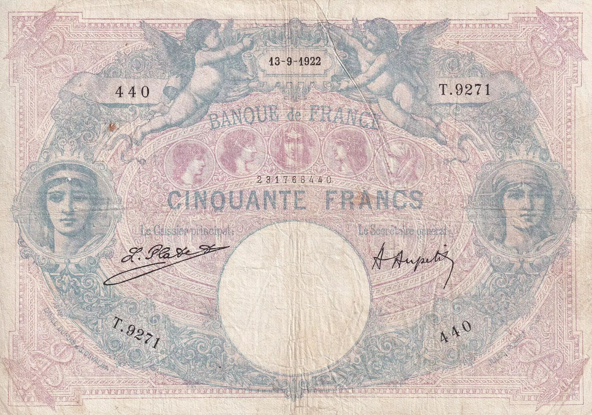 Accueil > Archivage > France 50 Francs - Bleu et Rose - 13-09-1922 - Série T.9271 - F.14.35