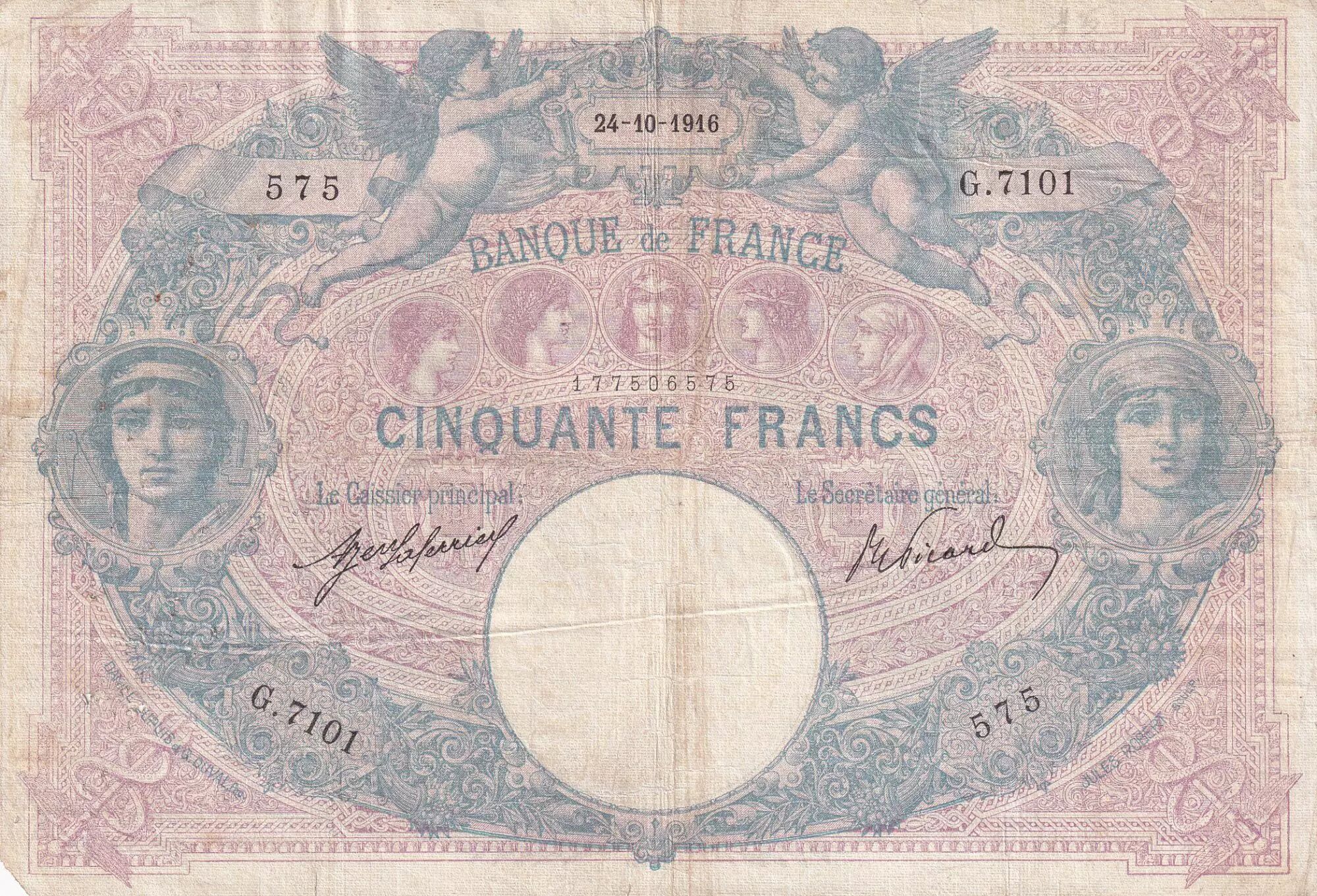 Accueil > Archivage > France 50 Francs - Bleu et Rose - 24-10-1916 - Série G.7101 - F.14.29