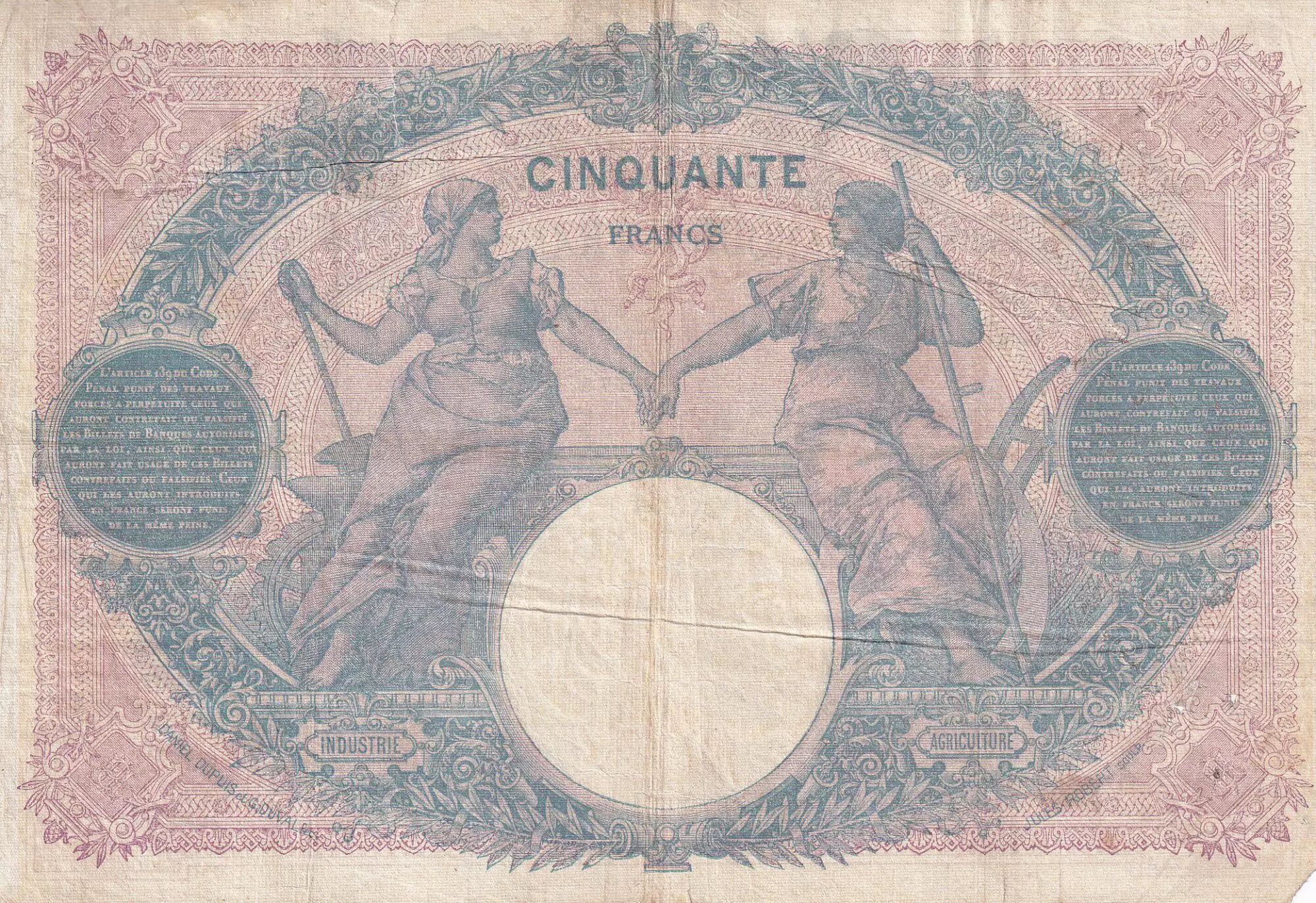 Home > > France 50 Francs - Blue and Pink - 24-10-1916 - Serial G.7101 - P.64