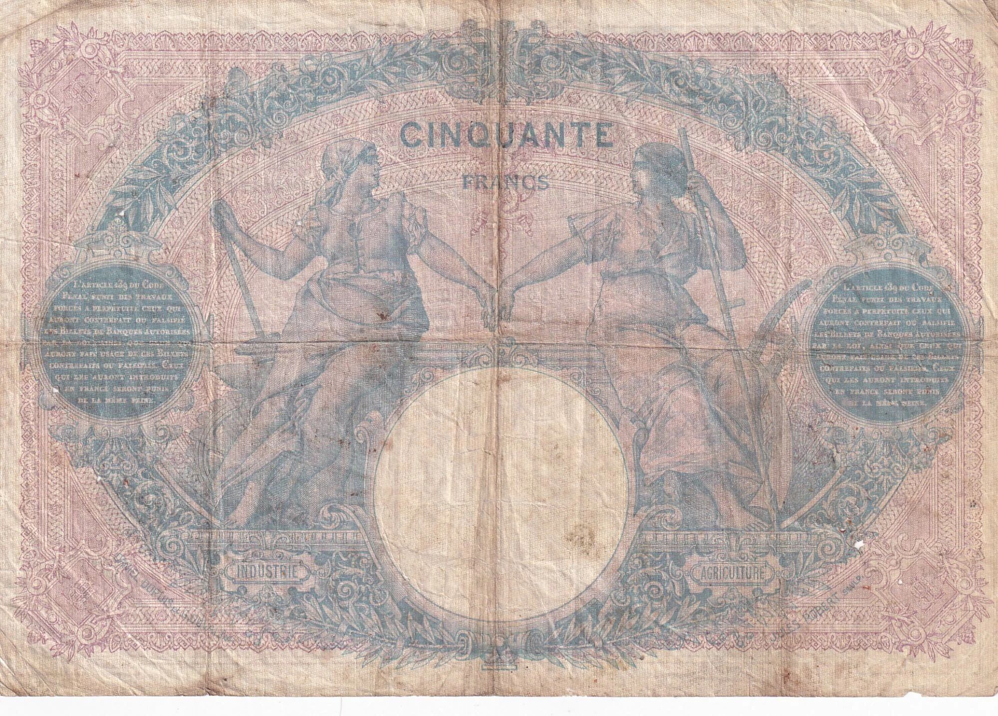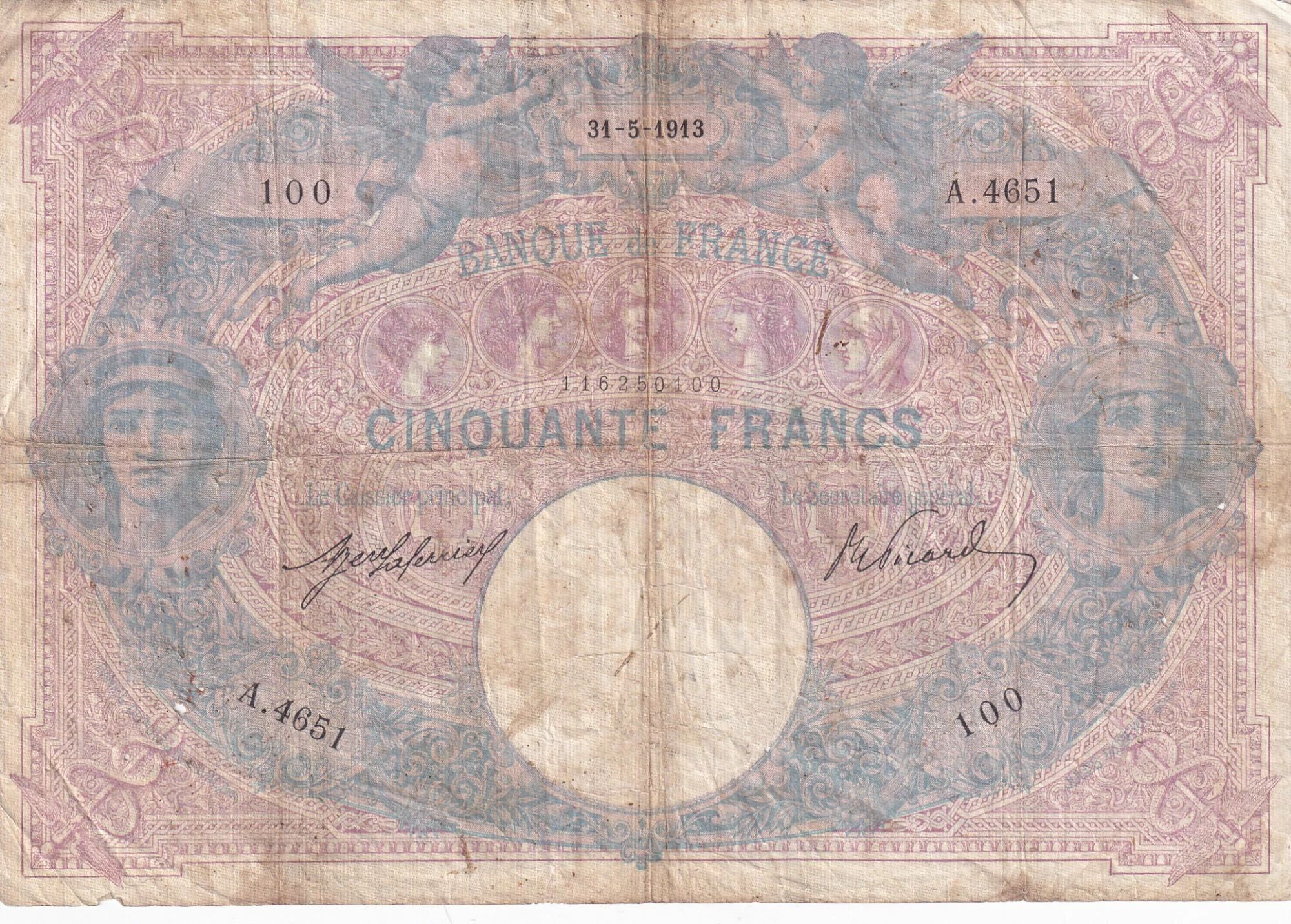 This French banknote with a face value of 50 francs was issued in 1913. It belongs to series A.4651. Its dimensions are 178 mm in length and 123 mm in width.
