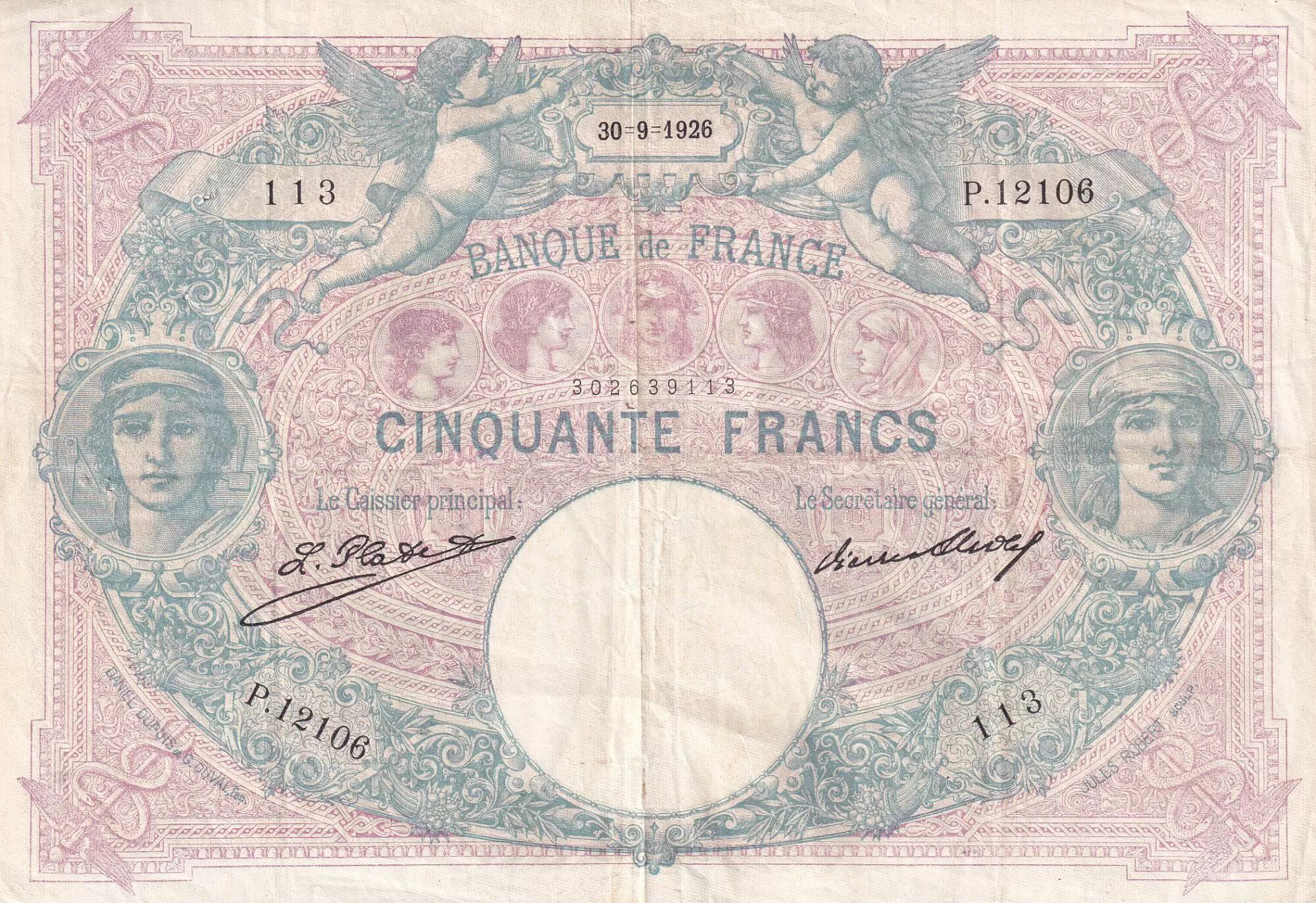 Home > > France 50 Francs - Blue and Rose - 30-09-1926 - Serial P.12106 - P.64