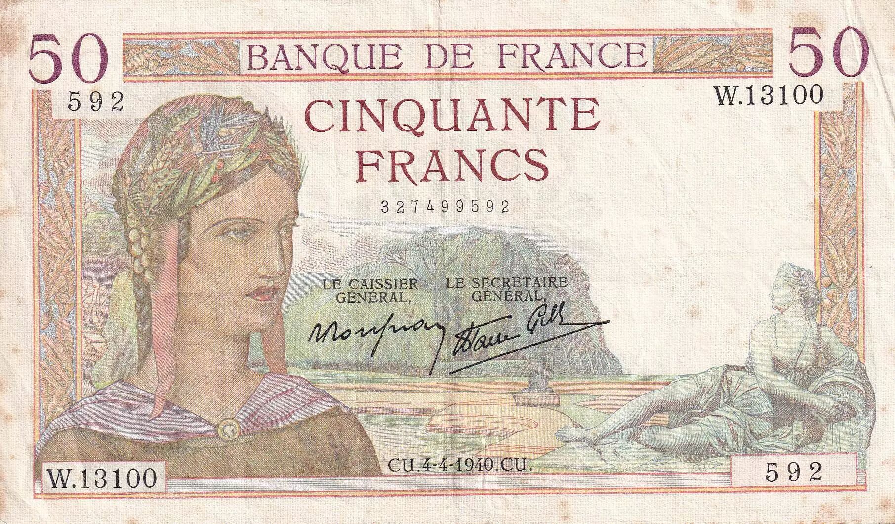 Banknote France 50 Francs - Cérès - 04-04-1940 - Serial W.13100 - VF - P.85