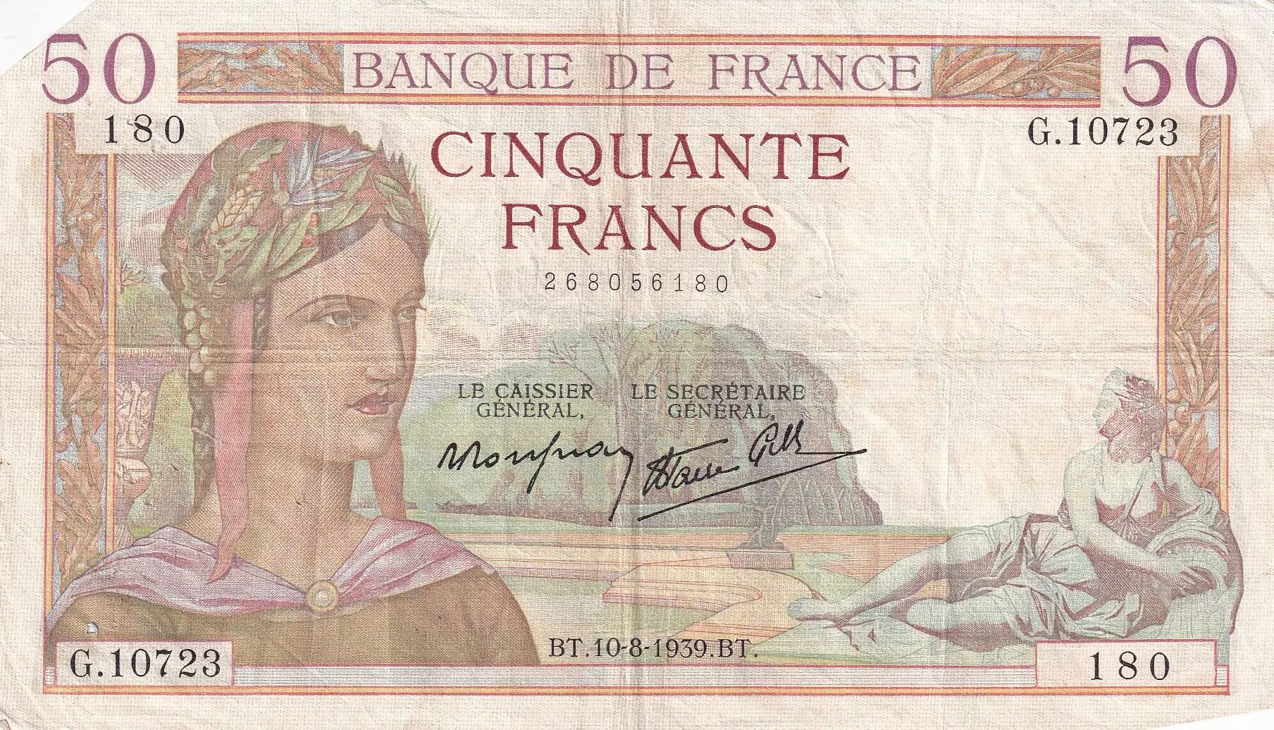 Banknote France 50 Francs Ceres - 10-08-1939 - Serial G.10723
