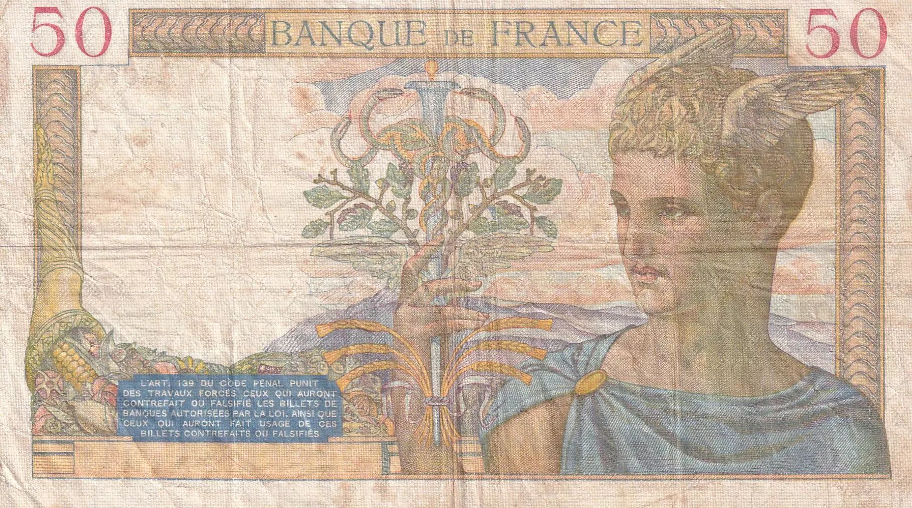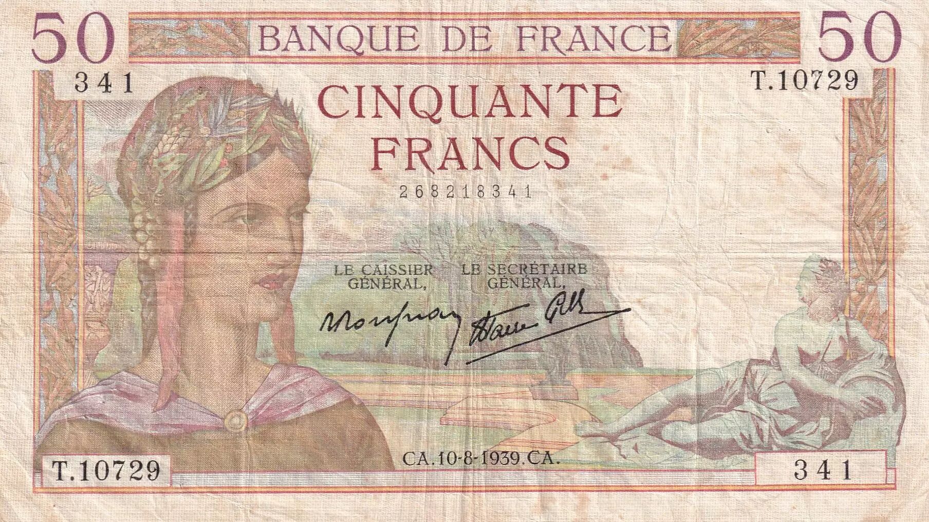 Billet France 50 Francs Cérès - 10-08-1939 - Série T.10729