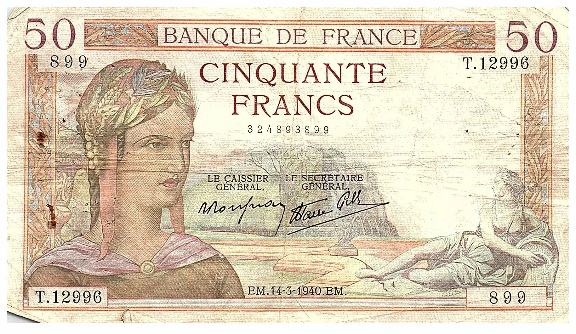 Accueil > Billets Français > Billets Banque de France > Billets 50 Francs > Cérès type 1933 (1933-1940) > France 50 Francs Cérès - 14.03.1940 - Série T.12996 - Fay.18.41