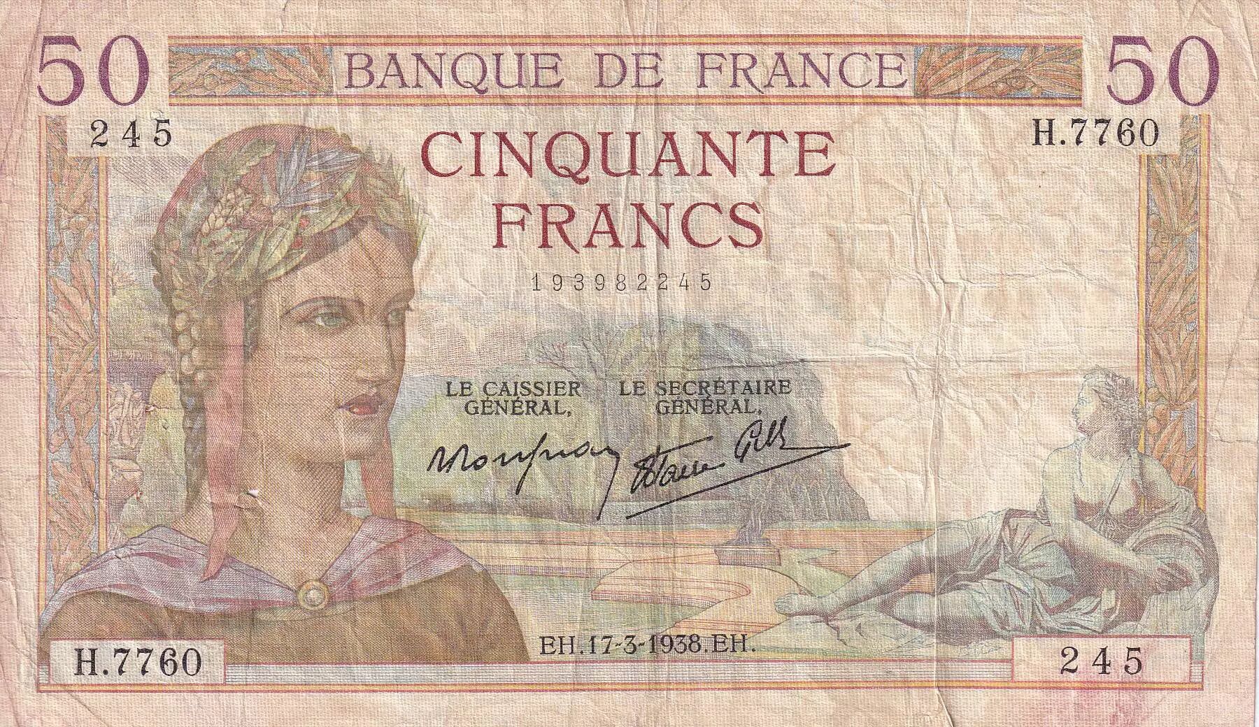 Home > > France 50 Francs - Cérès - 17-03-1938 - Serial H.7760 - F - P.85