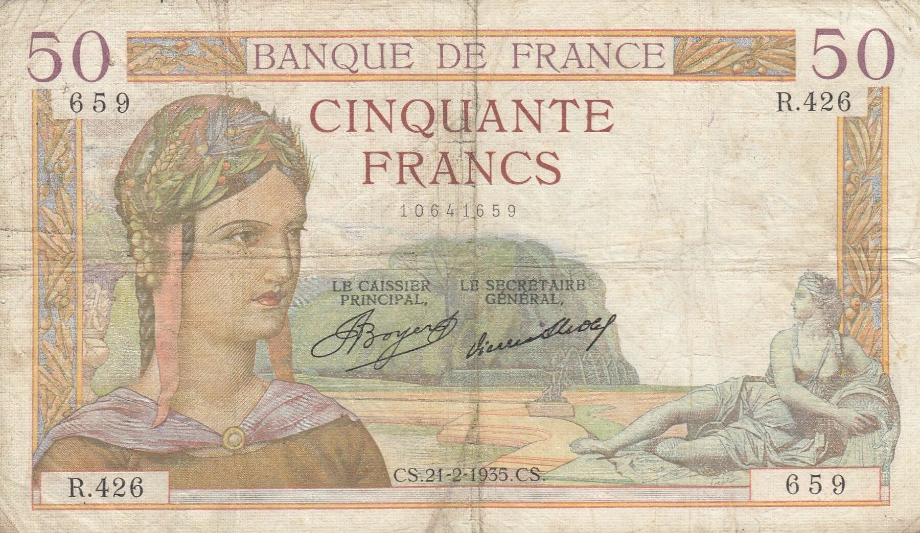 This banknote was issued by France in 1935. It represents a nominal value of 50 francs. The type of this banknote is Ceres, and it bears the serial number R.426.