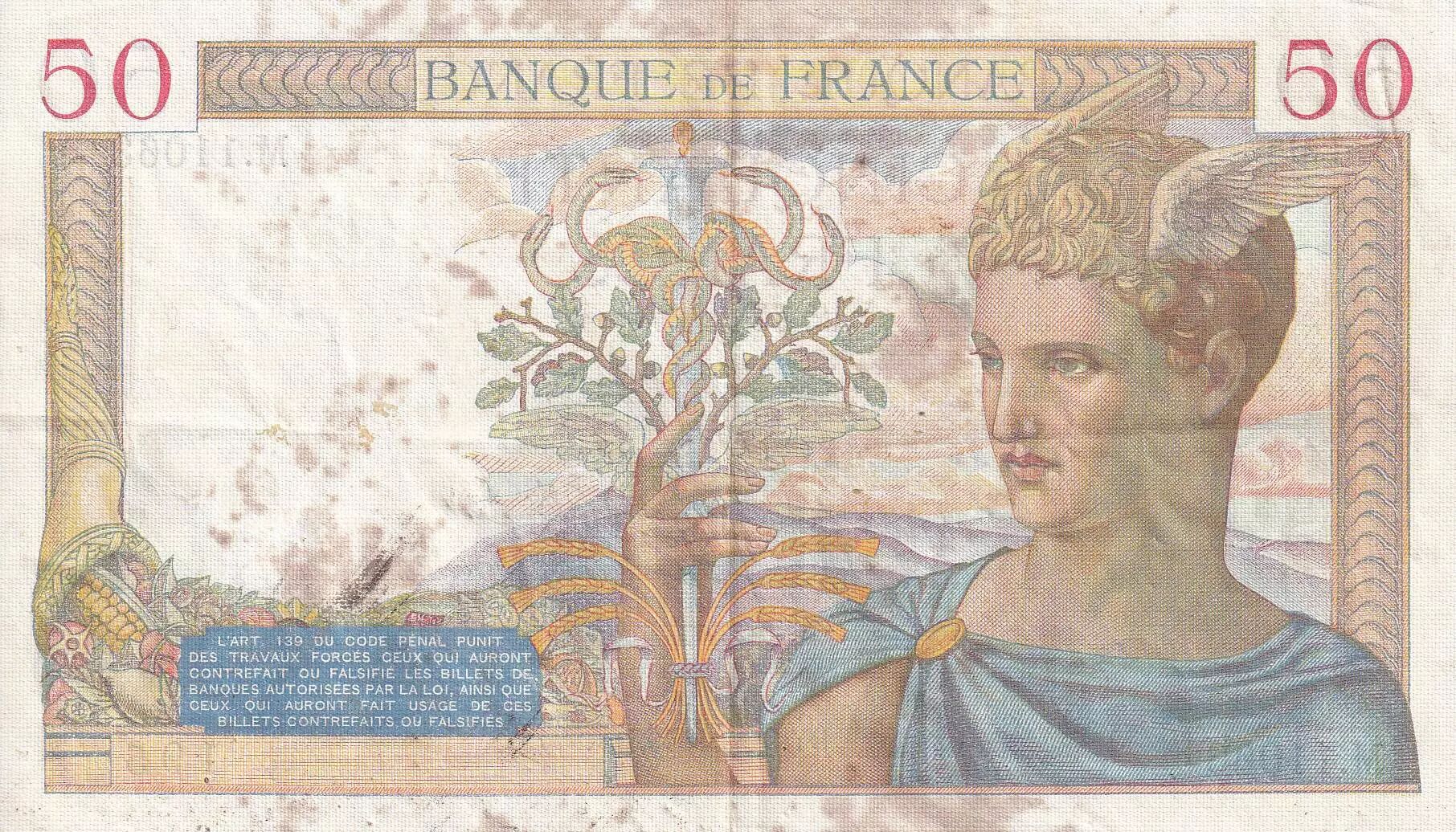 Home > French Banknotes > Bank of France Banknotes > 50 Francs Banknotes > Ceres Type 1933 (1933-1940) > France 50 Francs - Cérès - 21-09-1939 - Serial M.11063 - VF - P.85