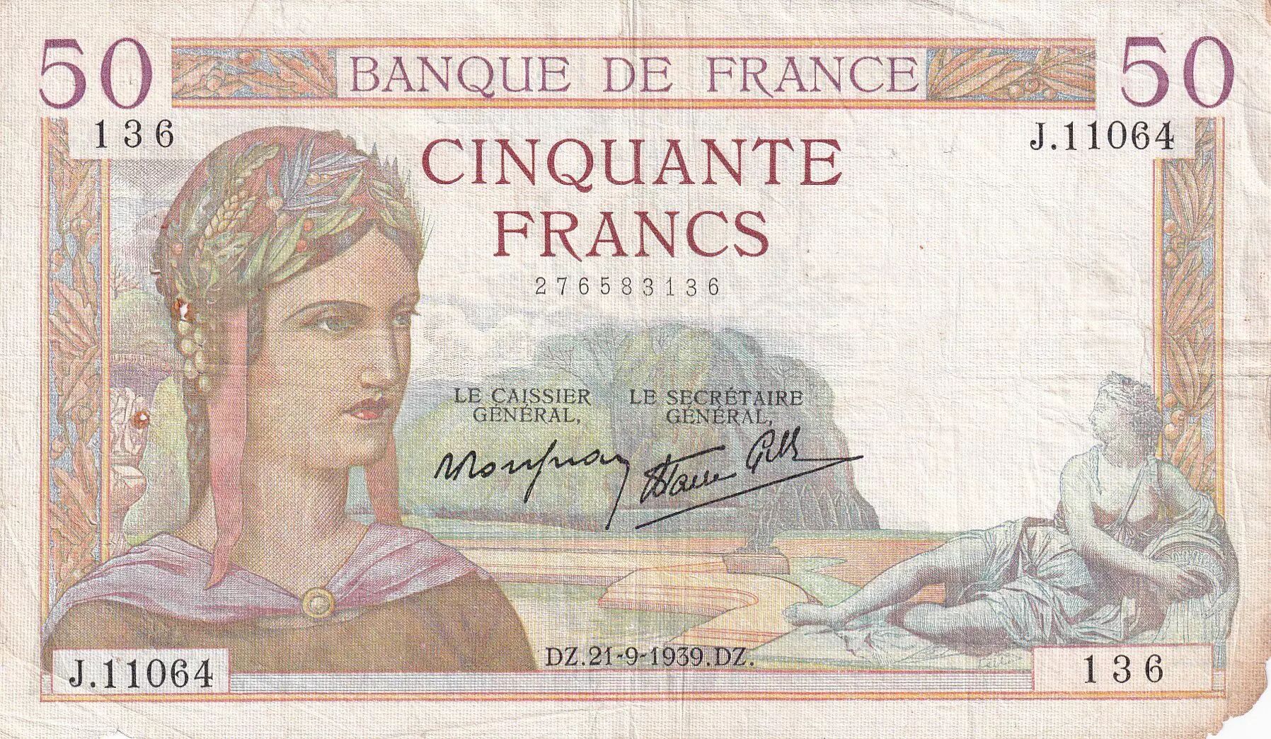 Accueil > Archivage > France 50 Francs Cérès - 21-09-1939 - Série J.11064 - F.18-31