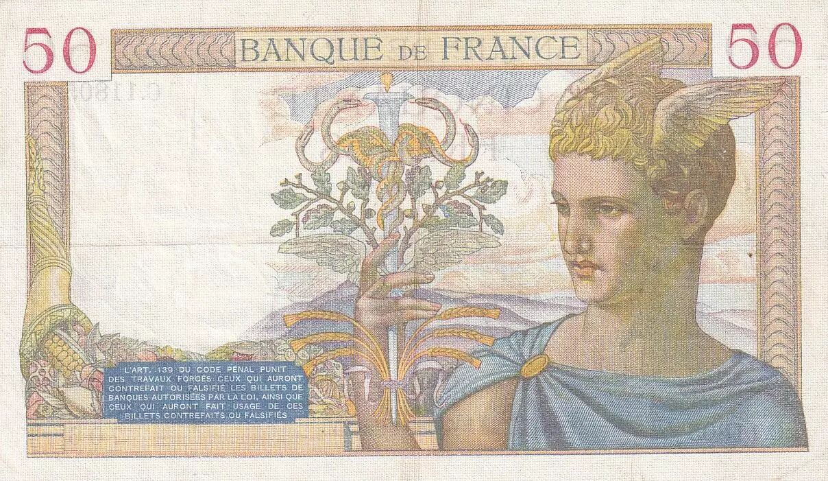 The face value of this banknote is 50 francs, a monetary unit that circulated in France. The design of the banknote features Ceres, a mythological figure associated with agriculture, harvests, and fertility. Its inclusion in the design evokes themes related to agricultural prosperity and abundance.
