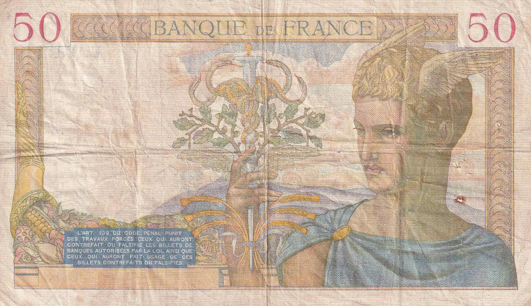Banknote France 50 Francs - Cérès - 22-02-1940 - Serial U.12611 - F - P.85