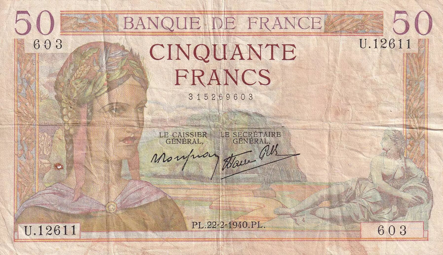 Billet France 50 Francs - Cérès - 22-02-1940 - Série U.12611 - TB - F.18.39